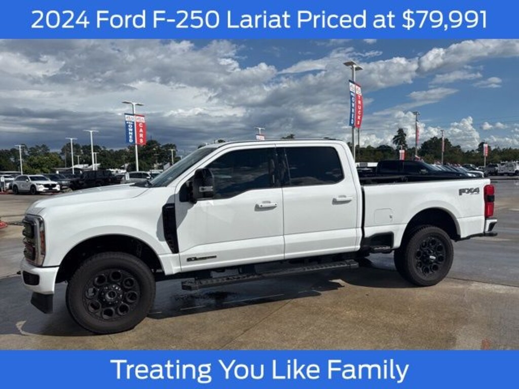 CARFAX One-Owner. Clean CARFAX. Oxford White 2024 Ford F-250SD Lariat 4WD 10-Speed Automatic Power Stroke 6.7L V8 DI 32V OHV Turbodiesel 4WD, 4-Way Adjustable Headrests, 6" Ebony Black Angular Running Boards, Black Appearance Package, Body Color Front & Rear Bumpers, Ebony Black Painted Front Grille Bars, Ebony Black Painted Mirror Caps, Front Sensing System, FX4 Off-Road Package, Head-Up Display, Hill Descent Control, Intelligent Adaptive Cruise Control w/Stop-and-Go, Lariat Ultimate Package, Off-Road Specifically Tuned Shock Absorbers, Pro Trailer Backup Assist, Pro Trailer Hitch Assist, Radio: B&O Unleashed Sound System by Bang & Olufsen, Rear Wheel Well Liners (Pre-Installed), SiriusXM Radio w/360L, SYNC 4 w/Enhanced Voice Recognition, Tailgate Step & Handle, Tough Bed Spray-In Bedliner, Unique FX4 Off-Road Box Decal, Upfitter Switches (6), Wheels: 20" Machined & Ebony Black High Gloss, Wireless Charging Pad.